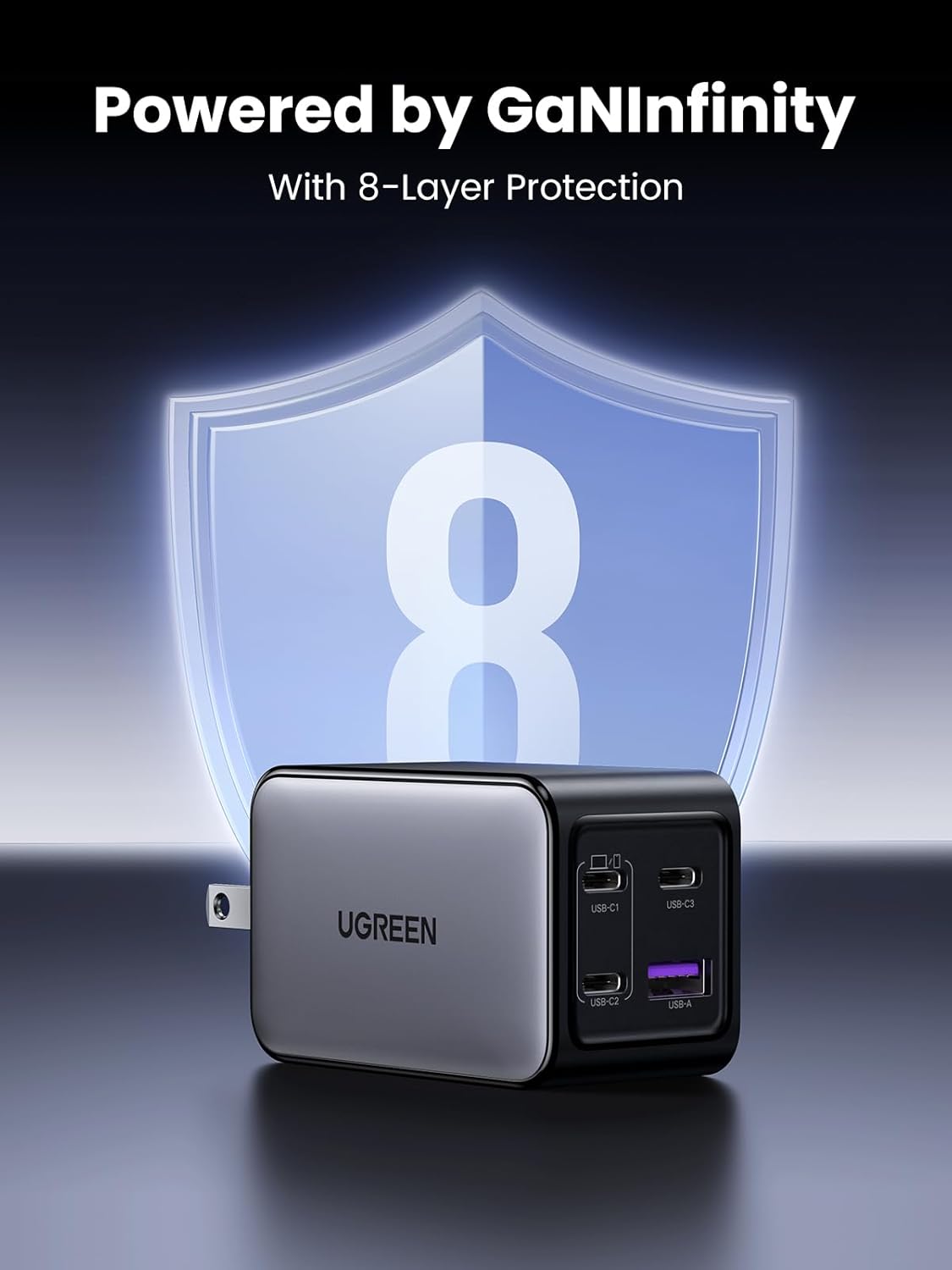 Powerful 65W Charging: Unleash rapid charging potential with the UGREEN 65W USB C Charger Nexode, designed to power up your devices with a 65W output, charging a MacBook Air to 51% in 30 minutes. Note: This requires an extra 5A USB-C cable that supports 65W fast charging. 4-Port Versatility: Equipped with 3 USB-C ports and 1 USB-A port, this GaN charger with foldable plug caters to diverse device (mobile phones, laptops, tablets and Steam Deck) needs, ensuring simultaneous charging convenience and activate your productivity Compact Size, Big Convenience: Experience portability with this 65W USB C charger block's compact build, making it the ideal travel companion or desktop accessory without cluttering your space, size: 2.64*1.65*1.5 inches GaN Technology for Safe Charging: Incorporating state-of-the-art GaN technology that is safer and faster, this 4-port power adapter can protect your devices from overcurrent and overheating Universal Compatibility & Scene Flexibility: Tailored for every scenario, from home to office, commute to travel, the 65W type C charger fast charging fits effortlessly into your lifestyle, powering through all your charging needs seamlessly Enhanced Durability: Built with high-quality materials, it ensures long-term durability and reliability, making it a robust choice for everyday use